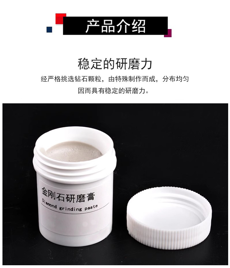 金剛石研磨膏適用于翡翠、瑪瑙、水晶、玉石,琥珀等工藝品、陶瓷硬質合金等高硬度材料制品的量具、刃具光學儀器及其他高光潔度工件的研磨,拋光加工。